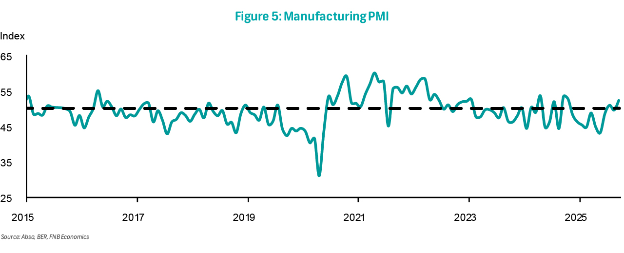 On the inflation front, outcomes have so far surprised to the downside relative to market expectations. Treasury may therefore lower its headline inflation forecasts from 3.7% (2025), 4.2% (2026), and 4.3% (2027) to levels closer to our projections of 3.3%, 3.5%, and 3.3%, respectively. It will be important to monitor how Treasury's forecasts align with the South African Reserve Bank's (SARB's) recently emphasised preference for inflation at the lower end of the 3-6% target range. Markets will be watching closely for any policy guidance from the Minister on this issue. Given its importance in signalling alignment, coordination and providing predictability, the Minister may make a pronouncement at the 2025 MTBPS.