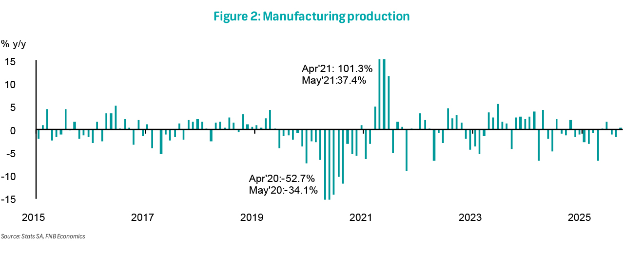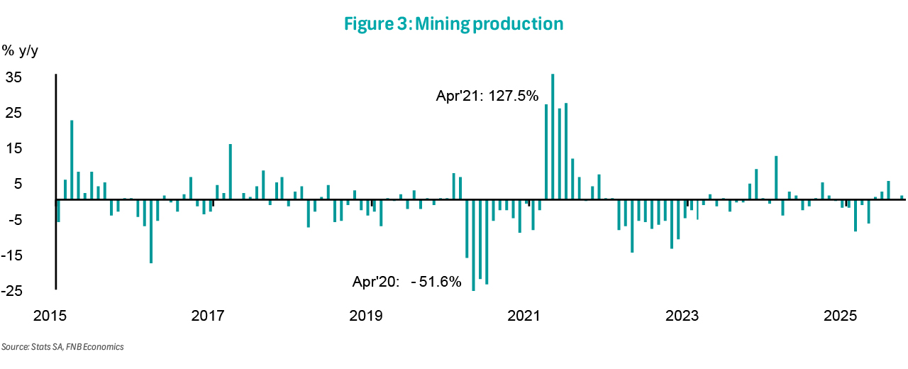 Mining production (not seasonally adjusted) expanded to 1.2% y/y in September, from a 0.0% (previously -0.2%) in August. Seasonally adjusted mining output grew by 2.2% in September, after a 0.9% decline in August. The strongest positive contributions came from PGMs, gold, and coal, while manganese and iron ore weighed negatively on overall production. As a result, output for the three months to September is up 2.5%, signalling continued positive momentum in 3Q25 and supporting quarterly GDP growth.