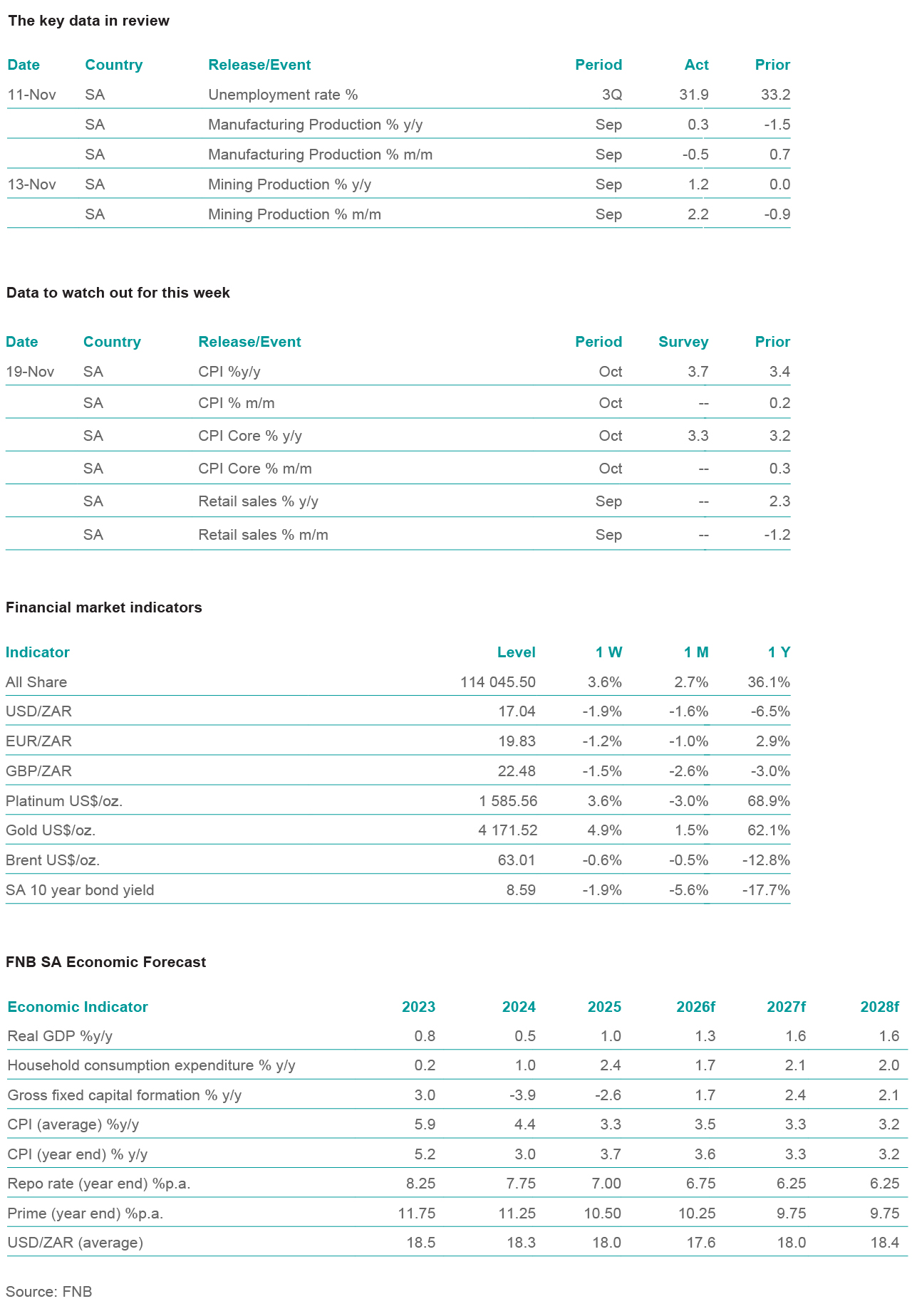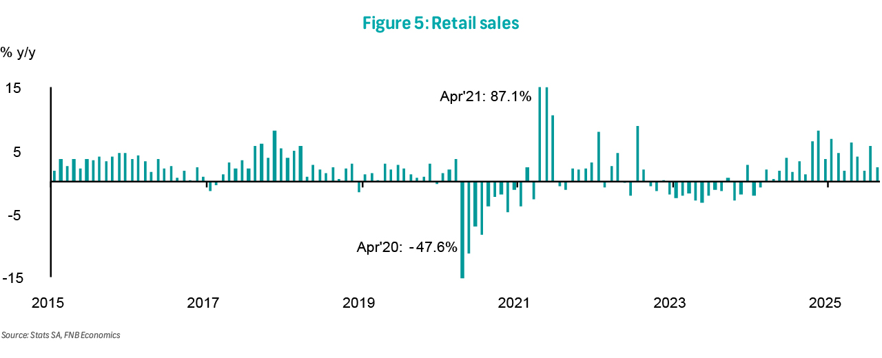 The Quarterly Labour Force Survey (QLFS), a household-based employment survey (not seasonally adjusted), reflected an increase in total employment of 248 000 q/q in 3Q25, following an increase of 19 236 in the previous quarter. Compared to the same quarter last year, employment improved by 109 000 to 17 055 000. The level of unemployment declined by 360 000 q/q (3 000 y/y), bringing the total number of unemployed individuals to 8 007 000. As a result, the official unemployment rate fell by 1.3ppts to 31.9%. The combined rate of unemployment and the potential labour force declined to 42.4% in the 2Q25, from 43.0% in the previous quarter. Despite this modest improvement, the persistently high unemployment rate highlights the ongoing vulnerability and weakness of the labour market. This challenge is further exacerbated by increased uncertainty about the potential employment effects of US tariffs on key sectors such as agriculture, automotive, machinery and equipment manufacturing, and mining (excluding critical mineral producers). Over the medium term, sustained structural reforms and accelerated efforts to diversify export markets will be crucial to support job creation and strengthen labour market resilience.