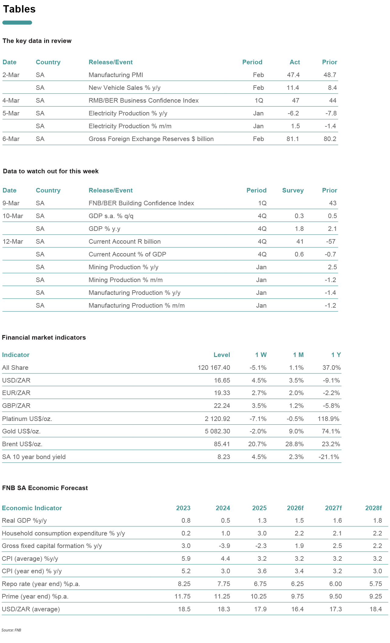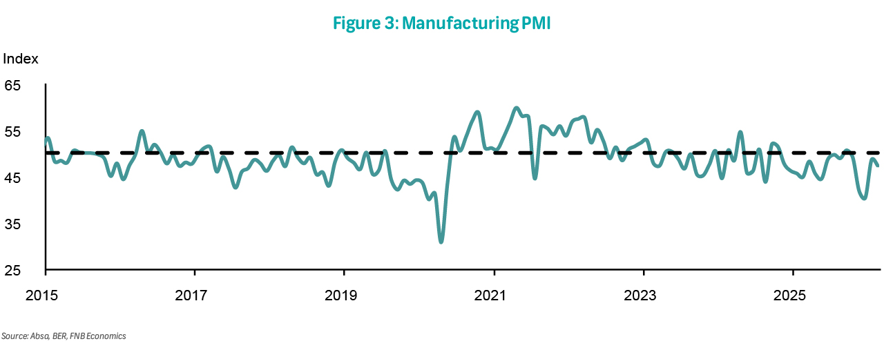 The manufacturing PMI fell by 1.3 points to 47.4 in February. Most subcomponents remained broadly unchanged; however, business activity slipped back into contractionary territory falling from 51.4 in January to 45.7. The employment index ticked down to 42.5 in February, from 43.9 in January, dragging the overall headline index. The new sales orders index moved sideways, and while the export sales index improved, it remains in contractionary territory. The index tracking expected business conditions improved, rising to 68.8 points from 66.4 in the prior month, highlighting that while conditions in February remained broadly negative, there is optimism that the outlook will improve. The manufacturing sector's performance continues to be constrained by shipment delays at South African ports, intermittent electricity disruptions, and weak demand.