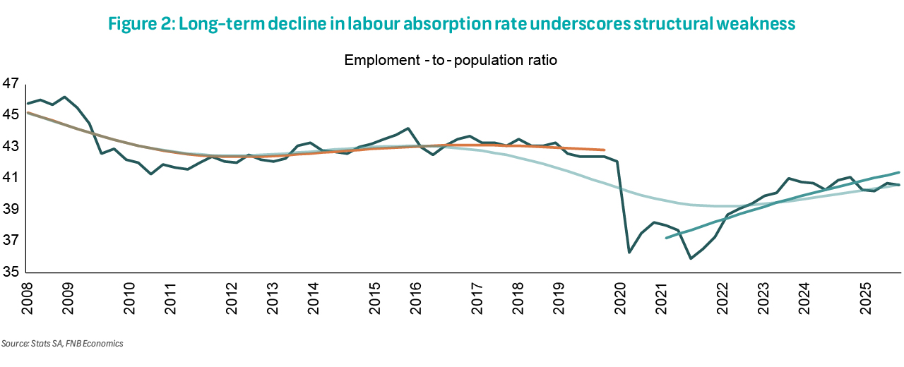 At 40.6%, the labour absorption rate remains well below the 46.2% peak recorded in 2008 (Figure 2), highlighting persistent structural weakness in South Africa's labour market.