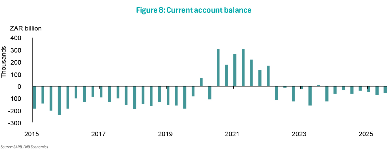 On Thursday, we will get current account data for 4Q25. In the previous quarter, South Africa's current account deficit narrowed to R57.0 billion from R72.2 billion in 2Q25. As a share of GDP, the deficit improved to -0.7% from -1.0% previously. This outcome reflected a smaller surplus on trade in goods and services. Export volumes fell, while import growth was largely driven by higher prices. Consistent with this, South Africa's terms of trade deteriorated as import prices rose faster than export prices.