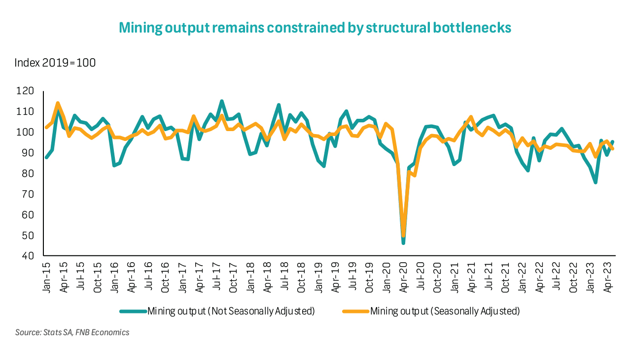 Mining output (not seasonally adjusted) shrank by 0.8% y/y in May after an expansion of 3.2% y/y in April, which was preceded by 14 consecutive months of annual decline. The outturn was worse than the Bloomberg consensus prediction of a 2.0% y/y expansion. Seasonally adjusted mining output, which aligns with the official calculation of quarterly GDP growth, shrank sharply by 3.8% m/m following a downwardly revised monthly expansion of 1.5% (previously 1.8%) in April. Though today's outcome is not encouraging, statistical base effects from February's sharp decline in output could see continued quarterly expansion in the mining sector's gross value added in 2Q23, which will be favourable for quarterly GDP growth. This is premised on expectations of better mining output in June, given the load-shedding reprieve during that month.