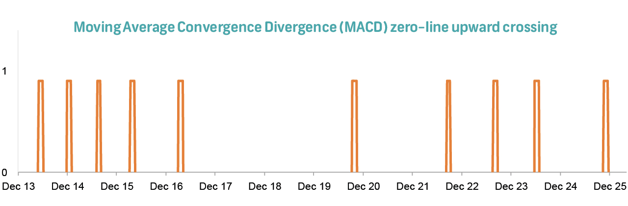 Although the Moving Average Convergence Divergence (MACD) histogram reflects ongoing downside momentum, historical patterns suggest that negative phases have been short-lived, with the price stabilising and recovering soon after. This indicates that sellers struggle to sustain control, and diminishing downside impulses may signal underlying resilience and renewed buying interest.