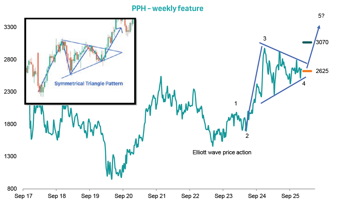 Our profit target is maintained at R42.00, with an initial and trailing stop-loss set at R35.00.