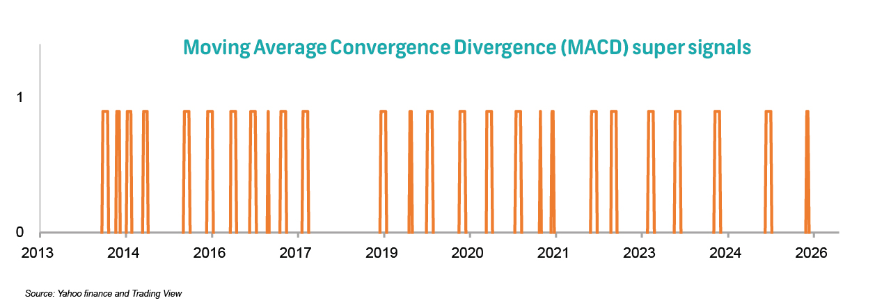 • The lower panel is the MACD super signal indicator for the stock - a reading of one indicates when such a signal occurred. The recent signal suggests that downside momentum has already been neutralised, and bearish pressure is largely exhausted, pointing to strong participation from buyers.