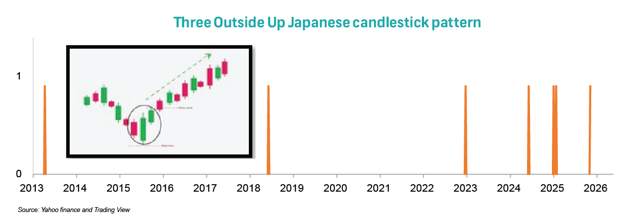 • The lower panel shows the occurrences of the Three Outside Up Japanese candlestick pattern (a reading of one indicates when such a pattern occurred). This pattern supports upside potential as it reflects a clear rejection of lower price levels and the emergence of sustained buying interest, often aligning with improving momentum indicators and stabilising trend conditions.